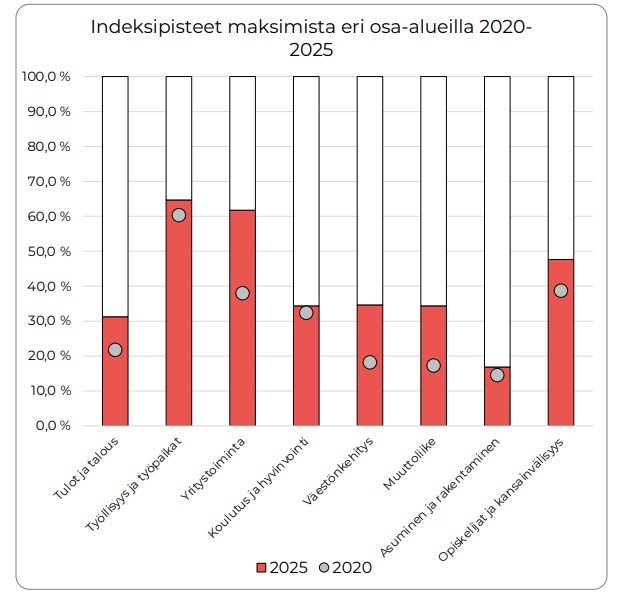 EVP-indeksi pitää sisällään 10 elinvoimamuuttujaa ja 10 veto- ja pitovoimaan liittyvää avainmuuttujaa, joista löytyy vertailukelpoista ja luotettavaa aikasarjatietoa. Viimeisimmän indeksin muutos on mitattu vuosien 2020-2025 aikana.