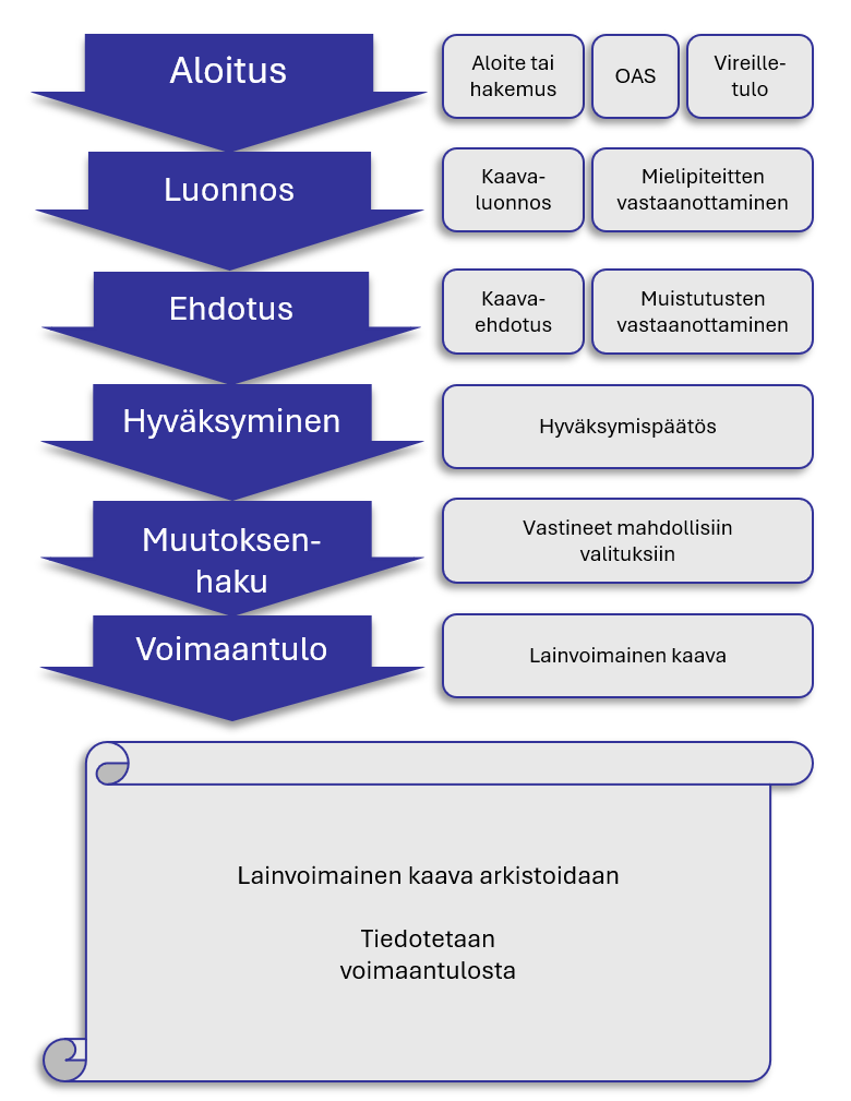 Kaavaprosessi muodostuu aloitus-, luonnos-, ehdotus- ja hyväksymisvaiheista.