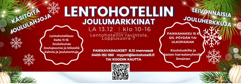 Tunnelmalliset joulumarkkinat Lentohotellin ravintolassa, Sotilaskodissa ja ulkoalueilla lauantaina 13.12.2025 klo 10-16! Markkinoiden yhteydessä on myynnissä joululounasta, joulupuuroa ja kiisseliä sekä kahvia ja joulutorttuja – tule nauttimaan aidosta joulun tunnelmasta!