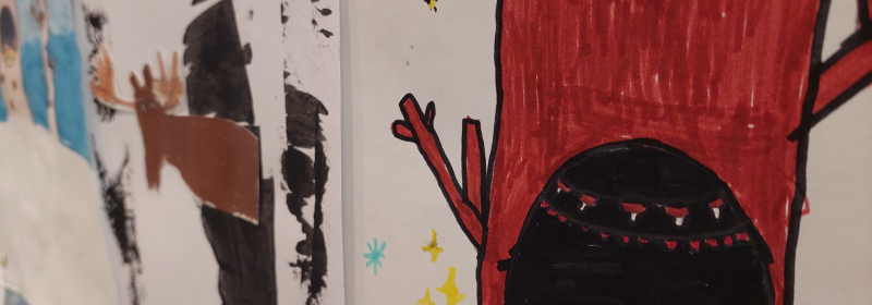 Pääkirjastossa on esillä Kauhavan yhtenäiskoulun 4-luokkalaisten oppilaiden luontoaiheisia kuvistöitä.
