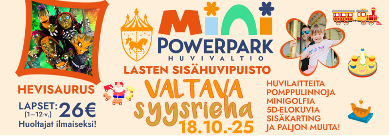 Mini PowerPark on nimensä mukaisesti PowerPark pienoiskoossa, jossa riittää riemua huvilaitteiden, kartingin ja hauskan yhteisen tekemisen parissa. Tämä lasten sisähuvipuisto on täydellinen paikka pienille seikkailijoille, jotka kaipaavat huvipuiston hauskuutta ja vauhtia myös pakkasten paukkuessa! Mini PowerPark on avoinna klo 10-16. Liput tapahtumaan verkkokaupasta tai ovelta tapahtumasta.